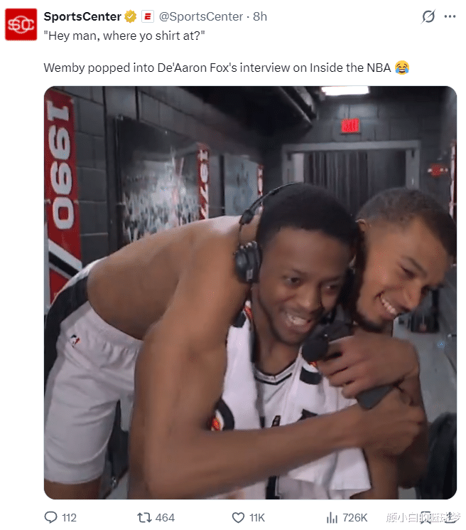 拿到福克斯28分7助攻6篮板4个三分1抢断2盖帽在赛后接受采访,结果文班亚马赤膊来影响福克斯采访,文班亚马与福克斯的关系非常之好,福克斯完全没有抗拒,他就这样让文班亚马抱着继续接受访问。