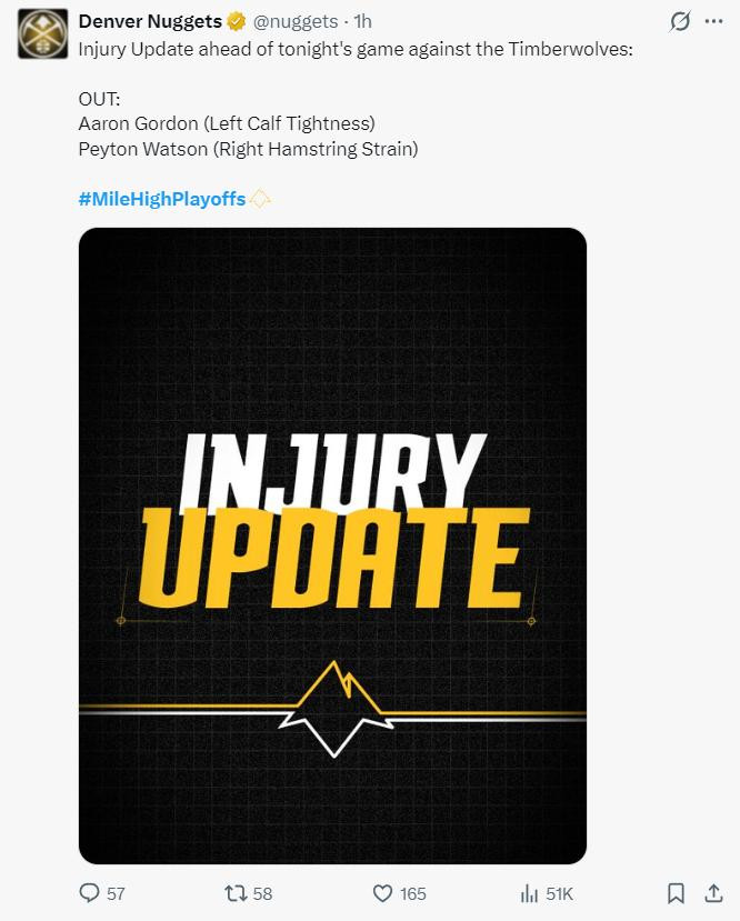 阿龙-戈登左小腿伤势无法出战,沃特森是肌肉拉伤继续缺席。