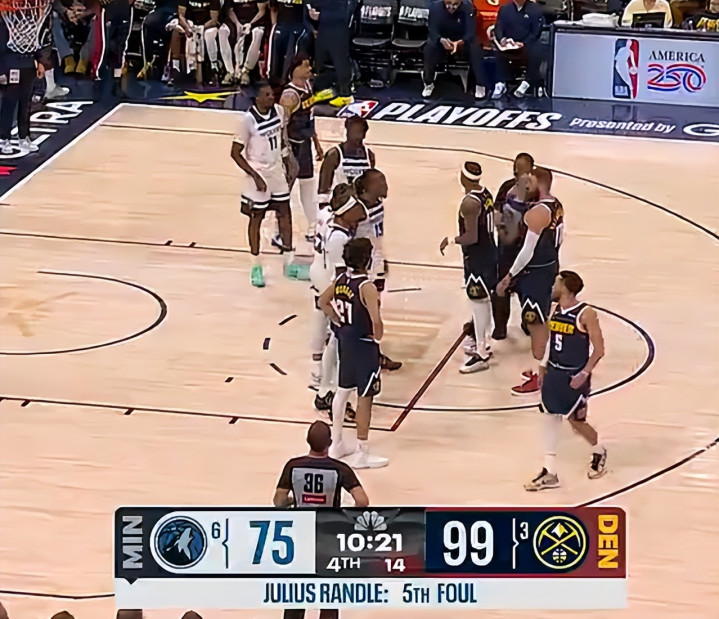 末节开场森林狼又一个失误,李凯尔手肘开路吃进攻犯规,麦丹与穆雷、瓦兰都险些爆发冲突,瓦兰与兰德尔又缠斗倒地,主场球迷的情绪被点燃了在骂裁判太烂了。瓦兰持球突破造犯规两罚一中,双方对抗太大每一个回合都充斥着犯规,麦丹被换下全场狂嘘。约基奇登场被打一波6-0阿德尔曼暂停,约基奇两罚全中,布劳恩关键三分,里德失误,掘金一波38秒7-0再度拉开分差,进入最后2分55秒森林狼换下主力放弃比赛。