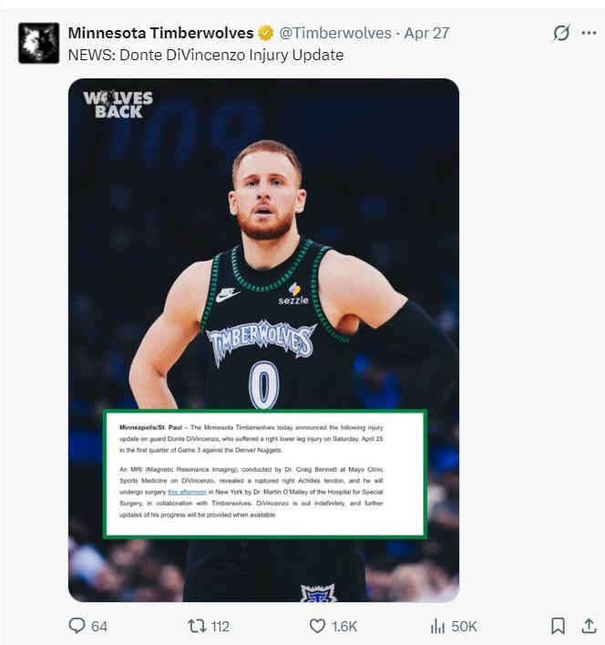 迪温琴佐确诊了跟腱断裂,等于森林狼此役缺少了两个先发球员。