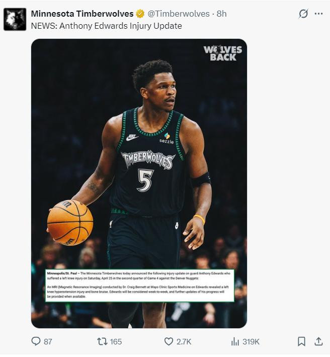 爱德华兹因为膝盖过伸伴随骨挫伤无法出战。
